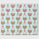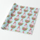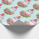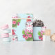 Papier enveloppant avec un design mignon et fantaisiste avec un adorable pingouin portant un chapeau de santa rouge. Derrière un bouquet de fleurs aux sucres de canne rayés roses et blancs.