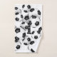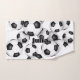 Cette serviette à main amusante sur le thème du football peut être personnalisée avec le nom de l'athlète au-dessus de l'image d'une bande de balles de football noir et blanc de taille variée - par katz_d_zynes