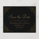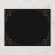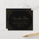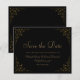 Cette élégante carte de mariage formelle vintage inspirée comprend le texte en or écrit en caractères script et serif, encadré par un délicat motif de vigne dorée vintage sur fond noir. Le cadre est répété au verso.