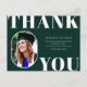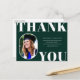 Cadre photo avant arrondi, carte postale de remerciement pour la remise des diplômes de la classe terminale. Fond de couleur vert uni, "MERCI" en caractères gras blancs et lignes de texte modèle pour le nom du diplômé, promotion de l'année et école.