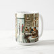 Parfait pour les amateurs de café et de voyage. Le tableau aquarelle saisit l'élégance intemporelle et l'ambiance animée d'un Caffè à Rome. L'intérieur traditionnel du café est orné de plans de travail en marbre, d'accents en bois foncé et de murs ornés de photographies vintages. Un barista en chemise blanche et cravate noire exploite une machine à expresso chromée brillante. Un homme plus âgé dans un blazer tweed lit un journal en sirotant un expresso à une petite table, tandis qu'une femme dans un foulard rouge brille son cappuccino à côté de son carnet de croquis. Une famille admire des croissants dorés et des biscottis colorés exposés dans une coque en verre. Un serveur transporte gracieusement un plateau de tasses en céramique entre les tables. Des rayons de soleil chauds filtrent la porte, jetant des motifs sur le sol carrelé, et à l'extérieur, les rues pavées de Rome et les teintes muettes des piétons ajoutent au charme dynamique et élégant de ce café emblématique.