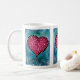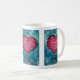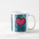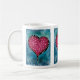 Un coeur rose cahot croustillant avec une garniture rayée noire serpentée sur un arrière - plan bleu et turquoise applaudi avec des reflets blancs.
