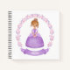 Une princesse aux cheveux bruns mignons dans une robe violette scintillante décore ce cahier. Le dos du cahier a un motif floral rose et violet délicat. Personnalisez-le avec votre nom. Fait un joli cadeau ou faveur de fête d'anniversaire. Conçu pour vous par Blackberry Boulevard.