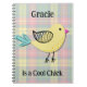 Mon oeuvre d'art graphique numérique originale est présentée sur ce cahier cool, composé d'un poussin jaune sur un fond à carreaux de couleurs similaires pour un style rétro. Il est écrit 'nom' "est une poulette cool" sur le devant, et vous pouvez changer le nom en haut en le personnalisant comme vous le souhaitez.