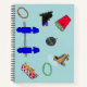 Un cahier génial avec des patins à quatre roues, des patins en ligne, une boisson gazeuse avec de la glace pilée, des bracelets en gelée, un baby-foot, une boule à facettes, des nachos et une piste de patinage avec des taches de lumière et une ébréchure à la surface.
