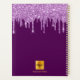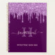 Un arrière - plan de couleur violet foncé et féminin élégant avec des gouttes de parties scintillant violette, gouttes, gouttes. Personnalisez et ajoutez votre nom, une lettre monogramme et un titre. Un planificateur pour l'organisation de clients d'affaires, de rendez-vous, de listes d'activités ou de votre vie quotidienne. Le nom est écrit avec un grand script à la main tendance avec des swashes. Pour que les swashes ne suppriment que le nom de l'échantillon, laissez les espaces ou émoticônes devant et après le nom. Lettres rose pâle et violette.