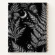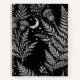 Conception botanique céleste présentant des feuilles de fougère détaillées, des fleurs sauvages et un croissant de lune sur un fond de nuit sombre. Cette illustration mystique de la nature combine les esthétiques botanique, céleste et cottagecore, créant un look inspiré d'une forêt magique.