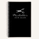 Cahier noir à spirale pour salon de coiffure ou barbier. Personnalisez avec le nom de votre entreprise ou titre. Design élégant de typographie script avec logo de ciseaux de coiffeur. Pratique pour les rendez-vous, la comptabilité et plus encore.