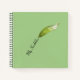 Plume. "Mes Gribouillis" est écrit en écriture cursive en biais depuis le coin inférieur gauche de la couverture du cahier (le texte peut être modifié). L'instrument d'écriture est une plume avec diverses nuances de vert, du foncé au clair. Le fond est vert clair.