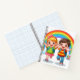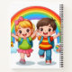 "Cahier coloré représentant un garçon et une fille de dessin animé courant sous un arc-en-ciel lumineux avec des soleils souriants, des papillons et des nuages duveteux – parfait pour les enfants et l'usage scolaire."
