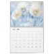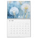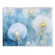 Le calendrier présente des fleurs de dandelion à différents stades de floraison dans un style vintage/rustique. Les fleurs sont dépeintes dans les tons bleu, blanc et jaune et dressées contre un arrière - plan bleu doux.