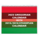 Ce calendrier comporte à la fois le calendrier éthiopien et le calendrier grégorien. Le calendrier éthiopien est 7 à 8 ans derrière le calendrier grégorien, a 13 mois au lieu de 12. La nouvelle année éthiopienne tombe le 11 ou le 12 septembre selon l'année bissextile. Ce calendrier peut être utilisé comme convertisseur de dates grégoriennes vers des dates éthiopiennes et vice versa.