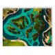 A vibrant aerial illustration of lush green islands and winding waterways, blending teal and emerald tones in a bold, futuristic style. This top-down view captures the intricate network of land and water, showcasing the unique beauty and architecture of floating landscapes.