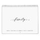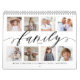 Envoyez un beau cadeau personnalisé à votre famille qu'ils chériront. Calendrier de collage de photos de famille personnalisé pour afficher vos propres photos de famille et souvenirs spéciaux. Le design de couverture frontale est composé d'un design simple de 8 collages photo avec "Family" conçu dans un style de script noir écrit à la main. Chaque photo est encadrée d'un simple cadre doré. Customisez avec le nom des membres de votre famille. Chaque mois présente une seule image grandeur nature avec le mois écrit en calligraphie noire élégante légèrement affichée sur chaque photo.