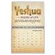 YESHUA, le nom de Jésus, le calendrier de Messiah. Ce calendrier mensuel comporte le nom, "YESHUA" (nom hébreu/Aramaic de Jésus). Le calendrier inclut 12 images de YESHUA avec des noms ou des titres et écritures saintes liées à chacun.