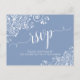 Ces magnifiques cartes de réponse RSVP de couleur bleu poussiéreux ou pervenche faciliteront la tâche à vos invités pour répondre à votre invitation de mariage. Elles présentent un design élégant avec une calligraphie scripturale en dentelle et de jolies volutes et boucles en dentelle florale blanche dans les coins. Le verso est un formulaire que vos invités doivent remplir et renvoyer en indiquant le nombre de participants et leur choix de repas. Il y a un espace pour entrer un site web afin que vos invités puissent répondre en ligne s'ils le préfèrent. Classiques et sophistiquées, ces cartes RSVP sont un merveilleux ajout à votre suite d'invitation de mariage.