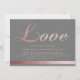 Elégante et élégante invitation à la calligraphie simple avec torsion d'or rose. Mise en page moderne avec script personnalisé "love" en or rose avec police moderne pour toutes les informations et bordure en or rose en bas sur un arrière - plan gris