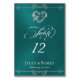 La conception présente un élégant fond sarcelle orné de bordures en volutes, d'un cœur et d'espaces réservés pour le numéro de table, les noms des mariés et la date de l'événement. Disponible en plusieurs couleurs pour votre thème de mariage. Conçu pour se coordonner avec la collection de mariage Romantic Scroll Hearts & Calligraphy. Pour modifier les détails, cliquez sur « Personnaliser ». Pour déplacer le texte ou modifier la taille, la police ou la couleur du texte, cliquez sur « Cliquez pour personnaliser davantage ».