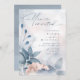 Une police de signature manuscrite combinée à une sans serif moderne est utilisée dans cette collection de papeterie florale pour donner un ton chaleureux et intime à votre mariage. L'invitation présentée ici présente des fleurs luxuriantes et des feuillages dans les tons allant du bleu poussiéreux au rose pâle contre un arrière - plan de scintillement de peinture à l'aquarelle rêveuse. Recherchez ID771 pour voir d'autres pièces et choix de couleurs pour cet ensemble.