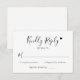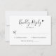 Elégante calligraphie moderne noir et blanc cartes de mariage RSVP comprennent un design de typographie élégant avec script de calligraphie chic, la fiancée à l’envers et le nom du marié avec un accent de coeur d’amour romantique. Texte personnalisé minimaliste pouvant être personnalisé avec la date d'échéance RSVP. Le design comprend une ligne pour le(s) nom(s) d'invité(s), la participation à l'événement et le nombre total d'invités présents.