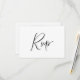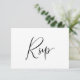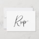 Une carte de boîtier RSVP simple et moderne en noir et blanc pour le minimaliste. "RSVP" est écrit en calligraphie de script joli, élégant et gracieux sur le devant de la carte. Au verso de la carte, vous pouvez personnaliser la date de réponse souhaitée et les options de repas que vos invités peuvent choisir dans une typographie minimale classique. Une carte RSVP classique et belle pour les mariages formels et informels.