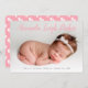 Faire-part bébé mignonne et minimaliste avec une photo de votre bébé. Ajoutez le nom de votre enfant dans un script de calligraphie rose. Le dos est orné d'empreintes de bébé en rose et blanc.