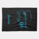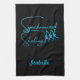 Turquoise Blue, une serviette de calligraphie personnalisée pour patineurs synchronisés - un cadeau pratique pour patiner synchronisé pour sécher les pales après l'entraînement.Couleurs: Glace bleu turquoise sur arrière - plan noir.Design: 3 patineurs faisant des arabesques + "Patinage synchronisé" en calligraphie + personnalisez avec le nom du patineur de glace.