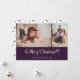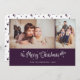 Des cartes photos de Noël Joyeux et violet personnalisés avec deux photos avec un titre calligraphique sur le devant et des étoiles violettes sur un arrière - plan blanc clair au fond. Personnalisez facilement ces calligraphies violettes cartes photos de Noël avec vos images, un nom de famille et l'année.