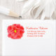 Élégant étiquette de adresse de réponse de mariage avec une fleur de camélia rouge ressort peinte en aquarelle sur un arrière - plan blanc. Idéal pour la coordination avec les mariages rouges et blancs ou pour le thème de la camélia fin d'hiver / mariage du début du printemps. Une partie de l'ensemble mariage d'aquarelle de camélia. Peinture et design uniques par Sarah Trett. www.sarahtrett.com pour mylittleedenweddings.com