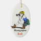 Cet article montre un photographe blonde avec sac à dos et caméra à la main. Il est personnalisable avec le prénom du destinataire. L'arrière montre une caméra avec les mots : Ce n'est pas la caméra, mais qui est derrière la caméra. Les mots sont imprimés en rouge.