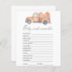 invitation citrouille avec un camion orange rempli de citrouilles. Éléments correspondants disponibles. Réponses : CRAVINGS, PLEIN, PACIFICATEUR, BOUTEILLE, LUMIÈRE NOCTURNE, LULLABY, STROLLER, ÉPIDURAL, BRÛLE, CHAISE HAUTE, SAC DE DIAPER, ÉPONSE