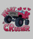 Illustration audacieuse et ludique d'un monstre rose avec des pneus surdimensionnés, entouré de graphismes cardiaques cassés. Le design comprend les mots "COEUR CRUSHER" en grandes lettres roses vibrantes, symbolisant le pouvoir, le plaisir, et une torsion gaie sur l'amour et le coeur.