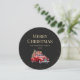 Carte de Noël Joyeuse en noir et blanc personnalisée avec un camion couleur rouge portant un arbre de Noël et des cadeaux contre un arrière - plan noir orné de neige tombante. Personnalisez facilement cette carte de vacances de camion rouge avec votre nom de famille.