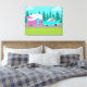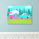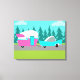 Ce Camper Rétro / Remorque et Voiture Stretched Canvas Print dispose d'un dessin de dessin de dessin moderne et minimaliste du milieu du siècle qui vous laissera prêt à prendre la route ouverte. Hommage aux années 1950, ce design présente une voiture turquoise vintage au sommet blanc, tirant une remorque kitschy vers sa destination finale. Le RV rétro, parfaitement restauré, a une moitié inférieure rose chaude, une moitié supérieure blanche et un éclair turquoise séparant les deux. La porte du côté du camping est également turquoise. L'accent final est l'aile rose chaud qui monte de l'arrière de cette maison sur roues. Les campeurs heureux roulent sur une route grise. La route est entourée d'herbe verte et luxuriante. Dans l'arrière - plan, on peut voir les silhouettes turquoises d'une véritable forêt de cèdres, contre un ciel d'aqua aux nuages bouffants et bleu clair. Ce design est parfait pour tous, des hippies à la retraite, des hipsters en herbe, ou tous ceux qui veulent revivre de grands souvenirs d'enfance. La meilleure partie est que personne ne demande : "Sommes-nous encore là ?"