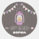 Un autocollant d'anniversaire sur le thème du camping, illustrant une lanterne violette et un bunting. L'Arrière - plan est d'inspiration bois. Personnalisez le texte. Recherchez les invitations correspondantes chez Jill's Paperie.