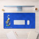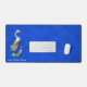 Un canard en bois peint et sculpté avec son canard, lourdement patiné, sur un arrière - plan bleu. Customisez en ajoutant votre propre texte.