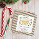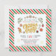 This square flat card features cheerful red and green diagonal candy stripes on a bright white background, accented with whimsical holiday graphics—including a gingerbread man, gingerbread house, candy cane, wrapped gift, and festive cookie — all adding a playful touch of Christmas magic.