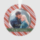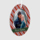 Cet ornement de conservation de vacances dispose de votre propre photo dans un joli cadre rouge et blanc de motif à rayures de bonbons de Noël qui a une garniture intérieure en argent. Une bannière verte tient votre texte customisé ; faites-le dire comme vous voulez ! L'autre côté a la même bordure de bande avec du texte supplémentaire sur l'intérieur blanc. Un cadeau élégant pour les jeunes mariés ou les couples.