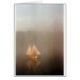 Un canoë avec deux voiles s'enfonce, dans la brume matinale.