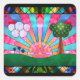 Un design numérique en vitrail de style Art déco, populaire au XXe siècle. Le motif de l'éclatement de soleil, largement utilisé, est central, s'élevant derrière un paysage vert équilibré par un arbre d'un côté et des nuages et des fleurs de l'autre. Les formes géométriques sont utilisées pour souligner la symétrie de la scène, avec l'arbre et les nuages faits de cercles qui se chevauchent. Diverses fractales aux couleurs vives donnent la texture et l'intérêt du "verre". La scène est encadrée de ferronnerie noire et de blocs en forme de losange dépoli avec des motifs fractaux foncés mais vives.