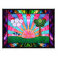 Un design numérique en vitrail de style Art déco, populaire au XXe siècle. Le motif de l'éclatement de soleil, largement utilisé, est central, s'élevant derrière un paysage vert équilibré par un arbre d'un côté et des nuages et des fleurs de l'autre. Les formes géométriques sont utilisées pour souligner la symétrie de la scène, avec l'arbre et les nuages faits de cercles qui se chevauchent. Diverses fractales aux couleurs vives donnent la texture et l'intérêt du "verre". La scène est encadrée de ferronnerie noire et de blocs en forme de losange dépoli avec des motifs fractaux foncés mais vives.