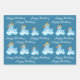 Voici trois feuilles de papier d'emballage en caoutchouc bleu, adorables et festives - parfait pour tous les amateurs de canard en caoutchouc ! Une feuille tient le canard en caoutchouc bleu avec des bulles de couronne assise sur un arrière - plan bleu pâle, la deuxième feuille tient des pois blancs amusants sur un arrière - plan bleu coordonné, et la troisième affiche le même canard en caoutchouc bleu dans les tailles de graduation avec les mots Joyeux anniversaire! tout au long.