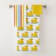 Serviette de bain colorée amusante pour enfants, avec la serviette de bain faite dans un motif de canards en caoutchouc jaune. La serviette est faite en rayures jaunes bleues et oranges et le linge est un solide jaune. Customisez d'ajouter le texte que vous voulez.