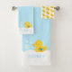 Quack, quack ! La serviette de bain en caoutchouc Ducky With Blue Heart Set conçue par Enchantfancy Design Company présente un mignon canard jaune avec un coeur bleu sur son aile. Le canard en caoutchouc jaune flotte sur des bulles de bain. Personnalisez avec votre choix de nom ! Ces serviettes font un cadeau adorable pour bébé ou un cadeau pour un jeune enfant.