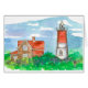 Une carte blanche avec le phare de Nauset sur Cape Cod, Massachusetts au toit rouge vif et fleurs sauvages violets rougeâtres illustrés d'encre et d'aquarelle.