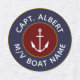 Capitaine personnalisée avec votre nom et nom de bateau nautique ancre logo fer sur étiquettes. Emblème de cercle classique bleu marine et marron avec ancre blanche et bordures de texte et d'or.