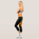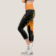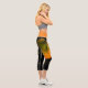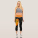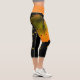 Leggings Capri orange et noir avec une grande feuille et de petites fleurs jaunes.