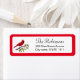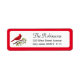 Cardinal mignon debout sur feuilles Holly avec étiquettes de adresse à cadre rouge.