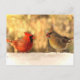 Voici une carte postale avec M. et Mme Northern Cardinal. C'est l'automne avec le feuillage glorieux dans l'arrière - plan mais la première neige est tombée pour nous donner un aperçu de l'hiver. Il est d'une brillante couleur rouge. Elle est orange, or et marron. Les deux ont des crêtes et des becs oranges. Ils sont vraiment le pourcentage des oiseaux jardins avec leur chant distinctif et leurs jolies couleurs.