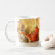 Voici une tasse mettant en vedette M. le Cardinal du Nord à gauche et Mme le Cardinal du Nord à droite. C'est l'automne avec le feuillage glorieux dans l'arrière - plan mais la première neige est tombée pour nous donner un aperçu de l'hiver. Il est d'une brillante couleur rouge. Elle est orange, or et marron. Les deux ont des crêtes et des becs oranges. Ils sont vraiment le pourcentage des oiseaux jardins avec leur chant distinctif et leurs jolies couleurs.